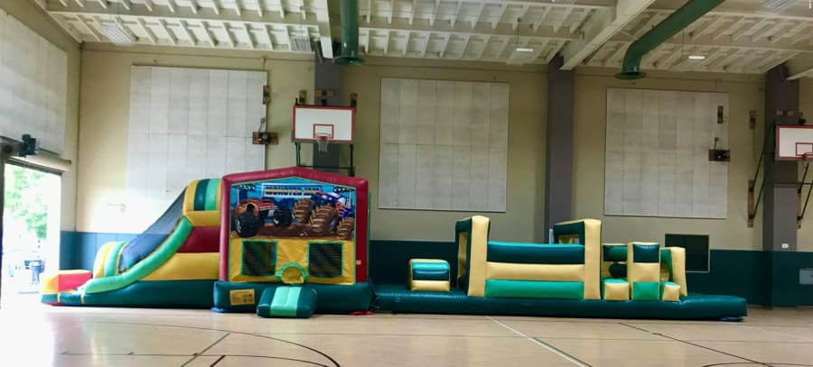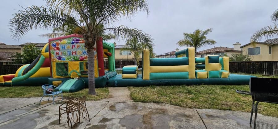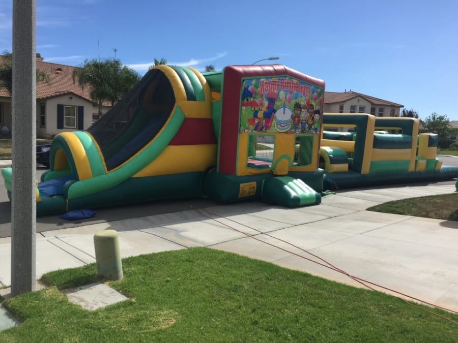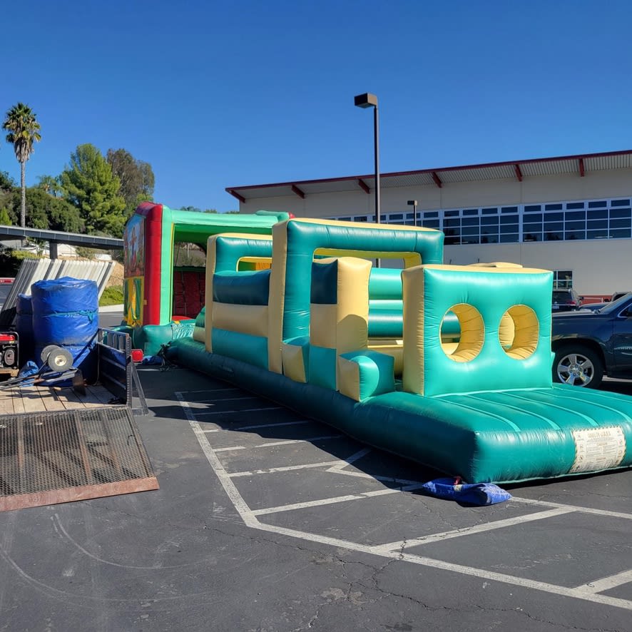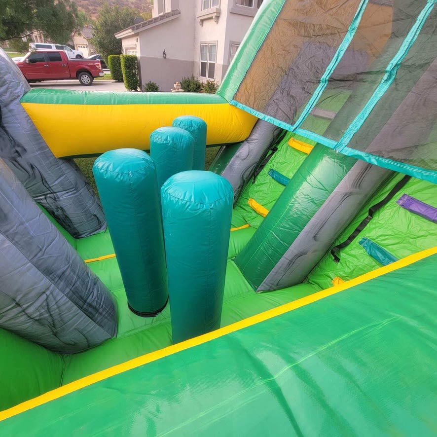 Explore the excitement of our 60 ft Jumperoo Obstacle Course, offering thrilling activities for all! Race through inflatable pillars, conquer obstacles, play with the inflatable basketball hoop inside, and end with a jumper and slide combo. Add a theme at the top from our selection of over 175 themes. If your theme isn't listed, contact us for a special order.