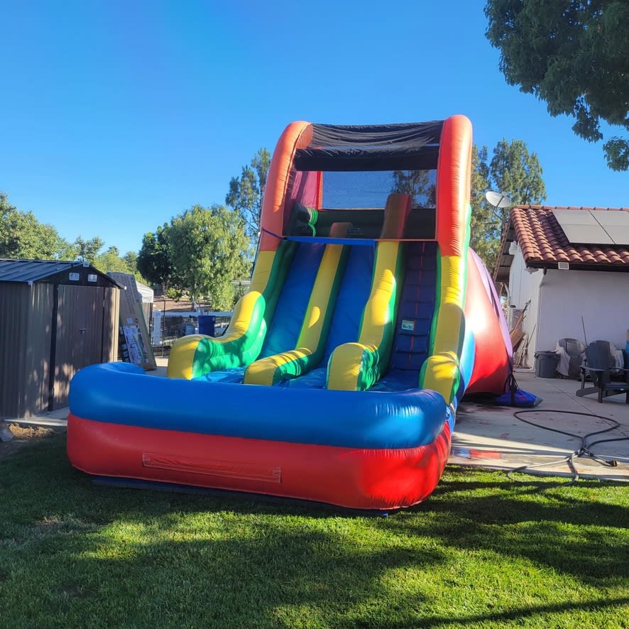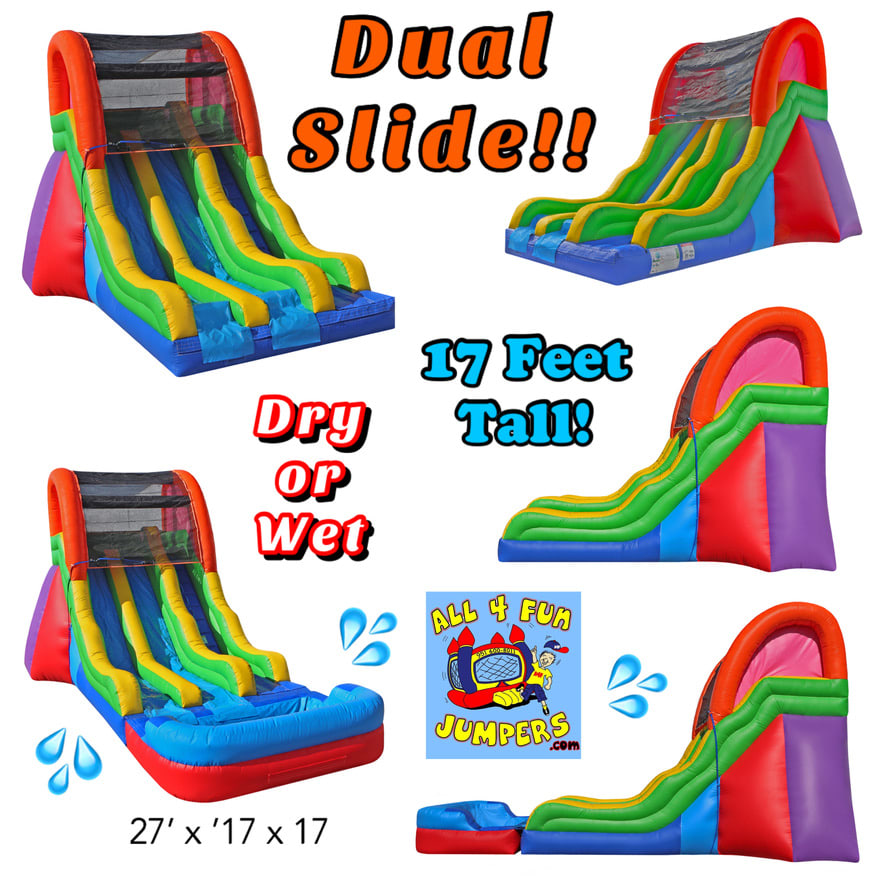 Introducing our 17-foot Dual Slide, where the fun is doubled! With two lanes, the line moves faster as two people can slide down simultaneously. This slide can be enjoyed as a dry slide or a wet slide, providing endless excitement for all. Due to its popularity, the Dual Slide gets reserved every weekend, so make sure to reserve it early! Whether it's to stay cool during the summer or warm up on cooler days, this slide guarantees a great time for everyone.