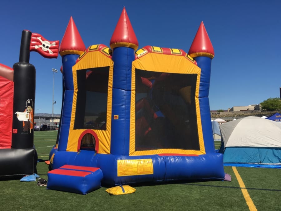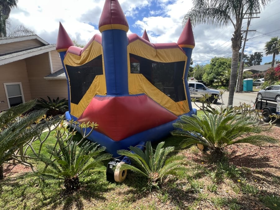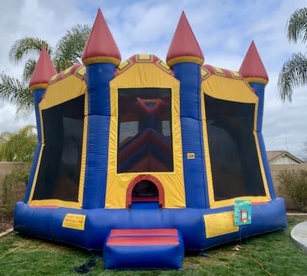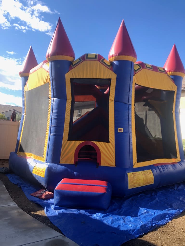 Enjoy the ultimate fun with our Castle 4 in 1 Combo! This combo packs four exciting activities in one: jumping, climbing, sliding, and an inflatable basketball hoop all inside. The slide is located at the back corner inside, covered on top for a cool and comfortable bounce.
