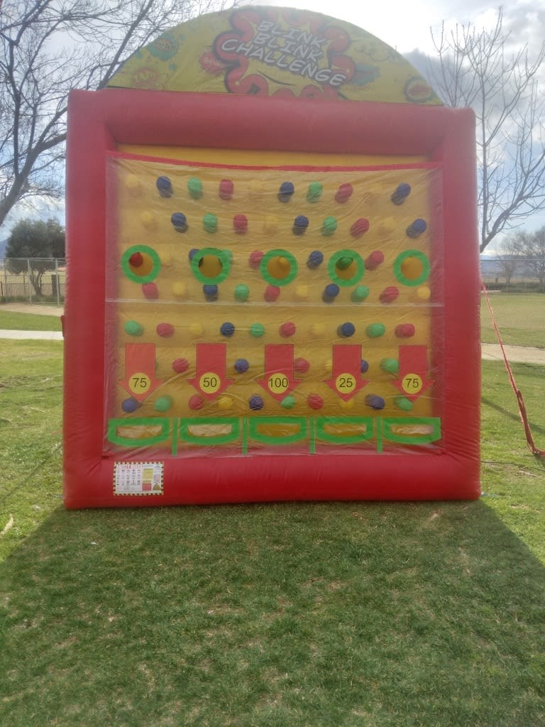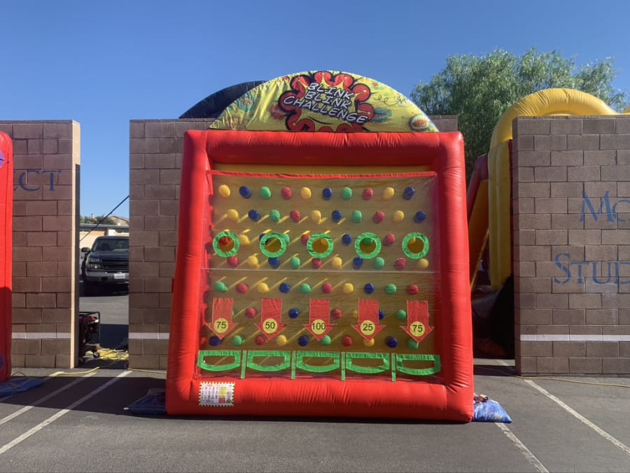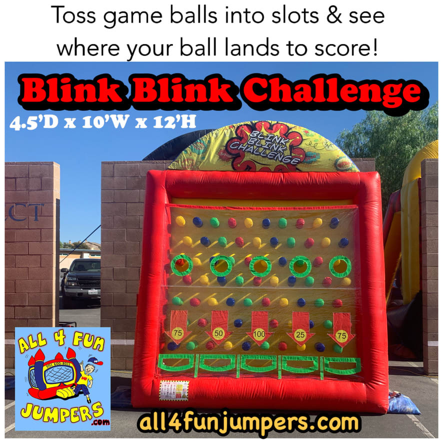 Engage your guests in a thrilling challenge with our Blink Blink Game rental with All 4 Fun Jumpers. This interactive inflatable guarantees hours of entertainment for all ages. Participants toss balls into the the above red bar or green circles, aiming to land the red ball and earn points. The scoreboard at the bottom keeps track of the lead.