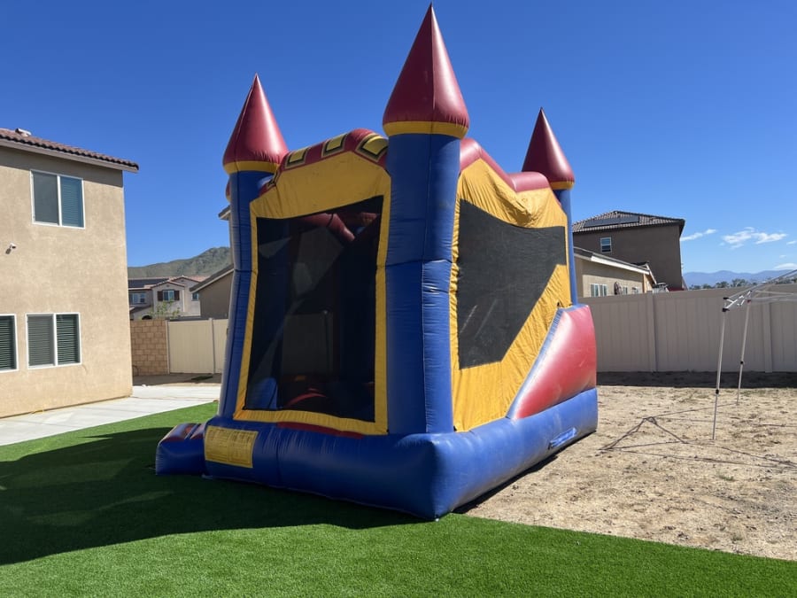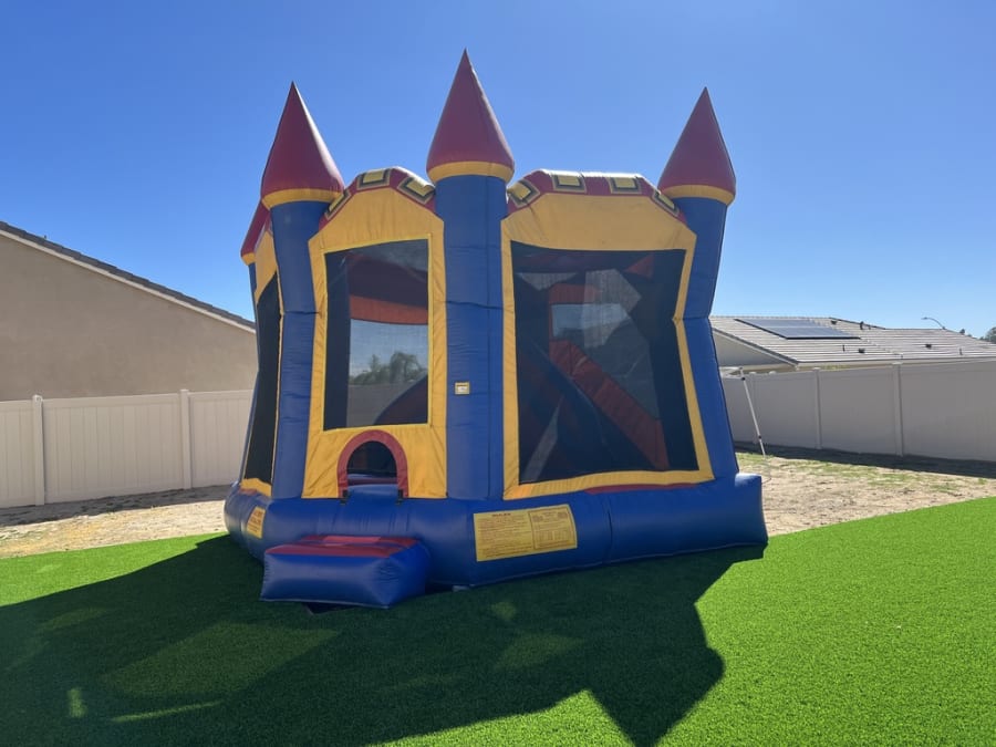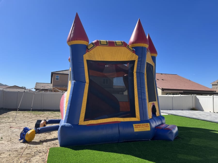 Enjoy the ultimate fun with our Castle 4 in 1 Combo! This combo packs four exciting activities in one: jumping, climbing, sliding, and an inflatable basketball hoop all inside. The slide is located at the back corner inside, covered on top for a cool and comfortable bounce.