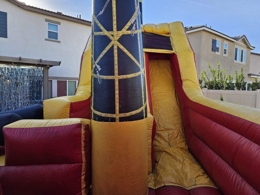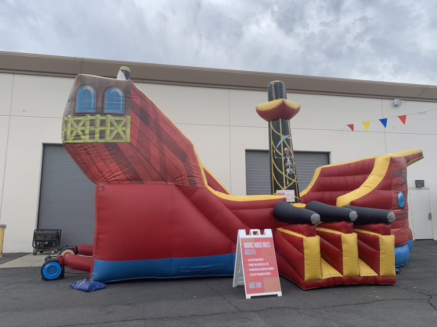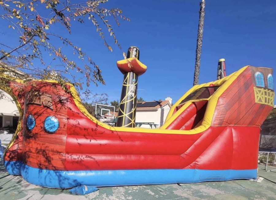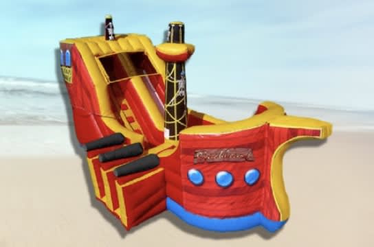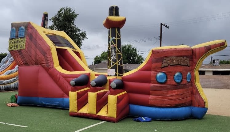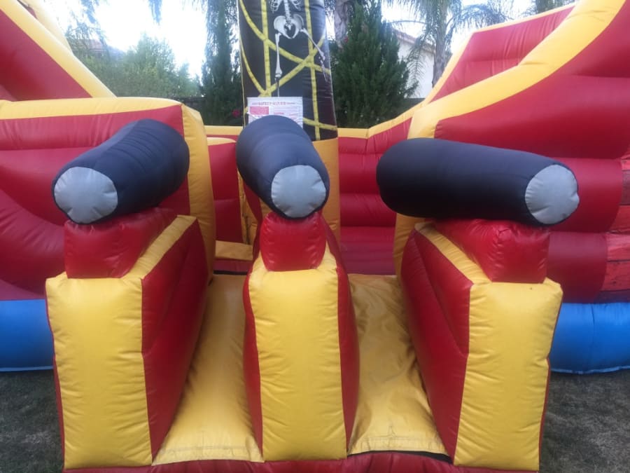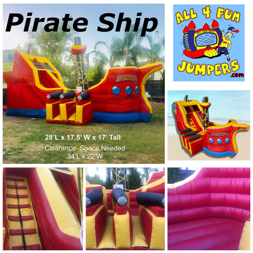 Step aboard the HUGE Pirate Ship from All 4 Fun Jumpers, a magnificent adventure for all ages! Imagination takes flight as guests climb high and slide down into the heart of the ship. Complete with cannons, a towering flagpole, and a central sail, this 28ft x 17.5ft x 17ft pirate ship is an impressive centerpiece that leaves guests in awe.