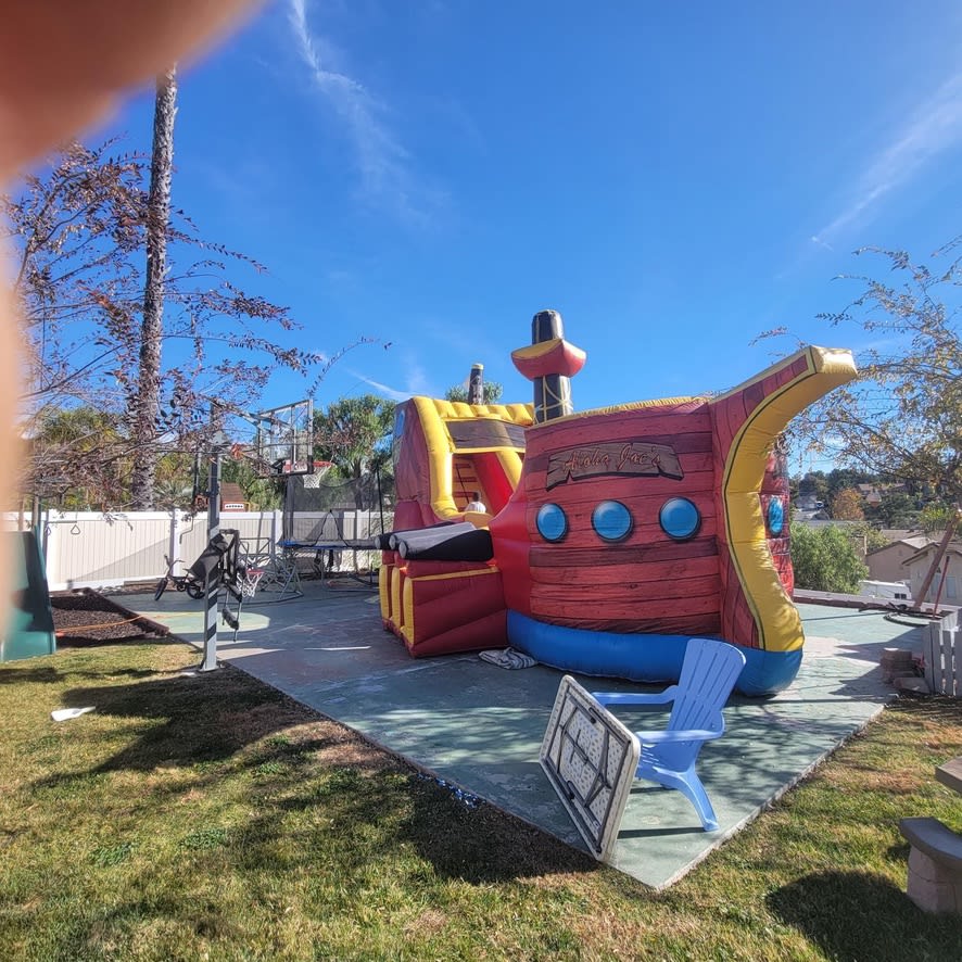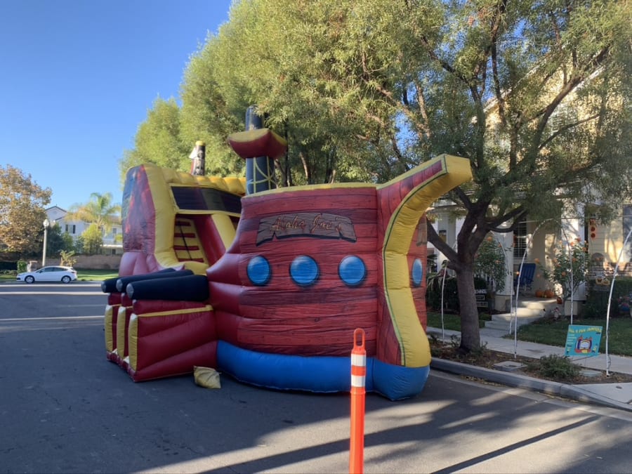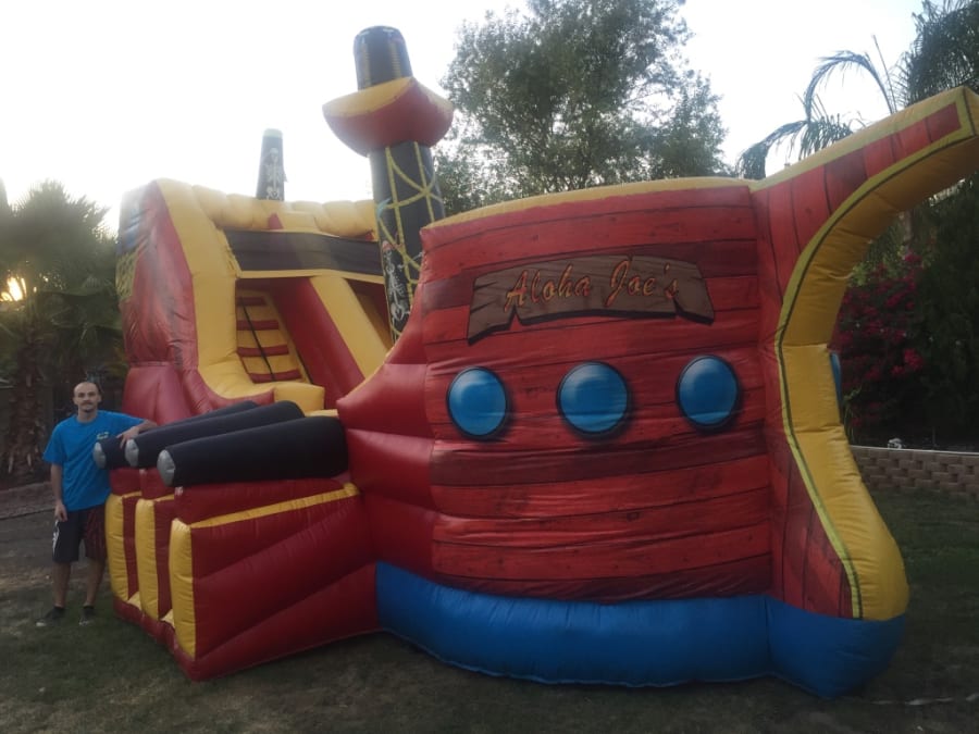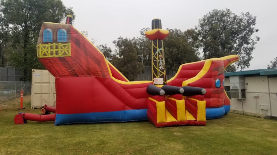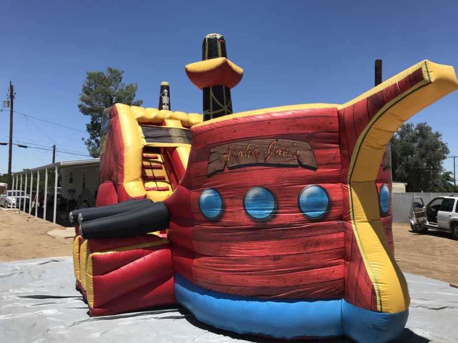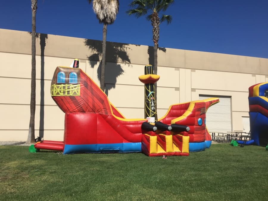 Step aboard the HUGE Pirate Ship from All 4 Fun Jumpers, a magnificent adventure for all ages! Imagination takes flight as guests climb high and slide down into the heart of the ship. Complete with cannons, a towering flagpole, and a central sail, this 28ft x 17.5ft x 17ft pirate ship is an impressive centerpiece that leaves guests in awe.