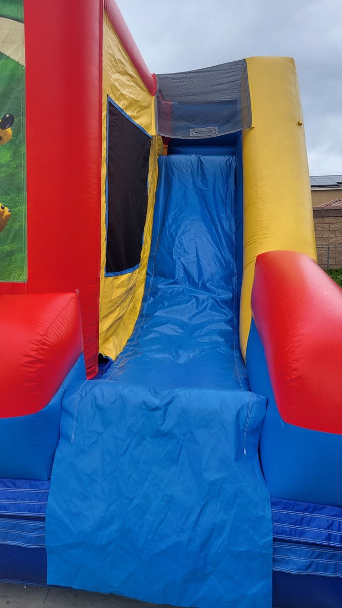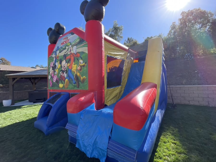 Introducing the licensed Mickey Combo for dry or wet use from All 4 Fun Jumpers, an absolute delight for Mickey-themed parties or Disney enthusiasts. This versatile Jumper and Slide Combo serves as a year-round attraction, doubling as a wet combo with a refreshing pool for summer splashing. Inside, kids will encounter inflatable pop-ups of Mickey and Donald, adding to the party atmosphere. An inflatable basketball hoop provides interactive fun, while an 8ft slide adds thrilling adventure.