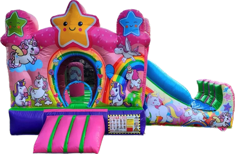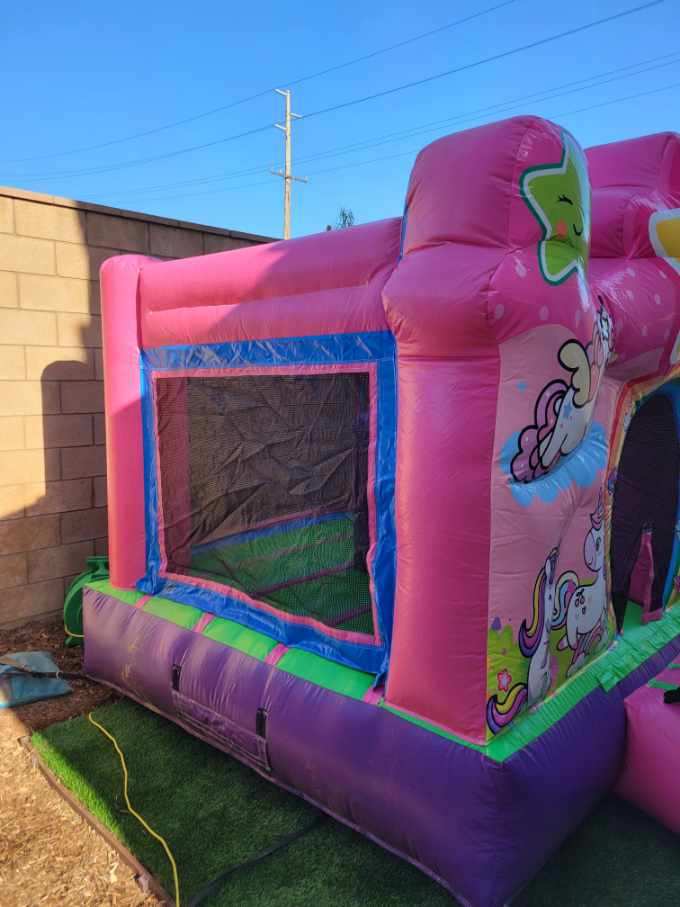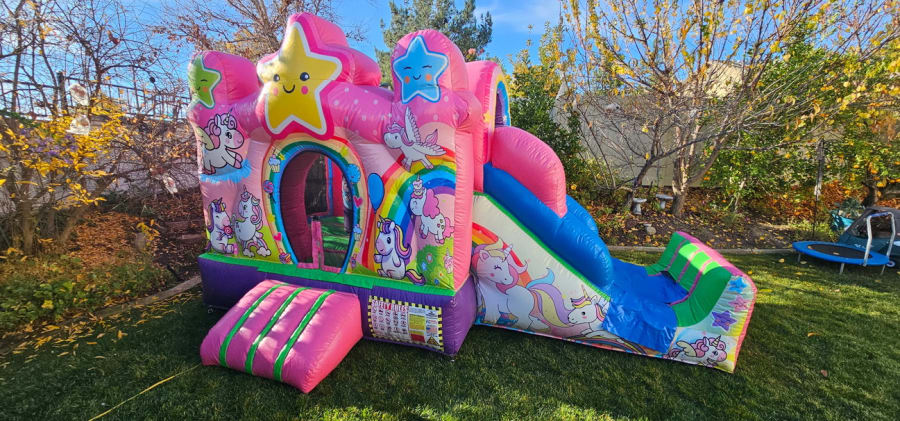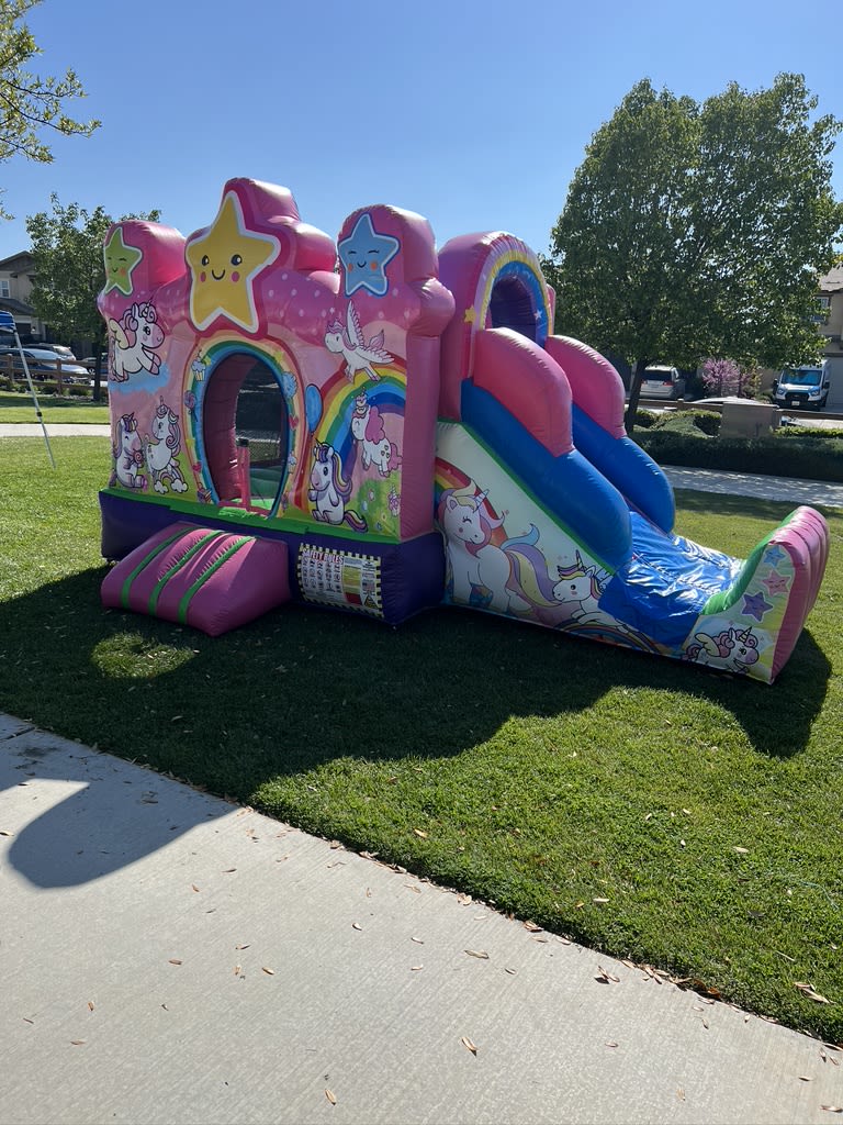 Introducing our adorable Unicorn Toddler Combo! A perfect entertainment option for your littlest ones, offering safe and exciting fun with jumping, climbing, sliding, and even an inflatable popup inside. This combo allows them to have a blast independently while you enjoy watching them. All 4 Fun Jumpers provides a range of party rental equipment to complete your event. Our seating options for children, like 48" round tables and 24' x 48' rectangle tables, are designed to match their size and needs. To add extra joy, we offer an automatic bubble machine, cotton candy, snow cone, and popcorn machines, ensuring a delightful experience for children.