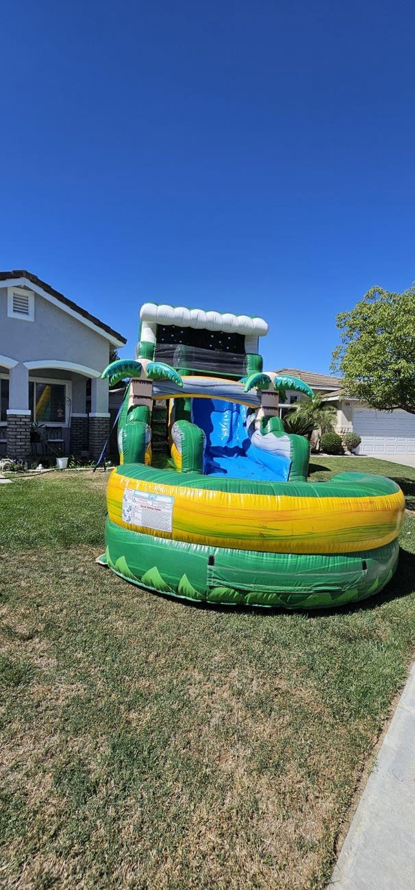 Introducing the 15ft "The Wave" Water Slide – a captivating tropical-themed slide perfect for Hawaiian, jungle, or reptile-themed events, or simply for beating the heat and having a blast! With a front ladder conveniently located next to the slide, supervision is easy, allowing you to witness all the fun in action. Your family and guests will cherish every moment of sliding down this thrilling waterslide.
