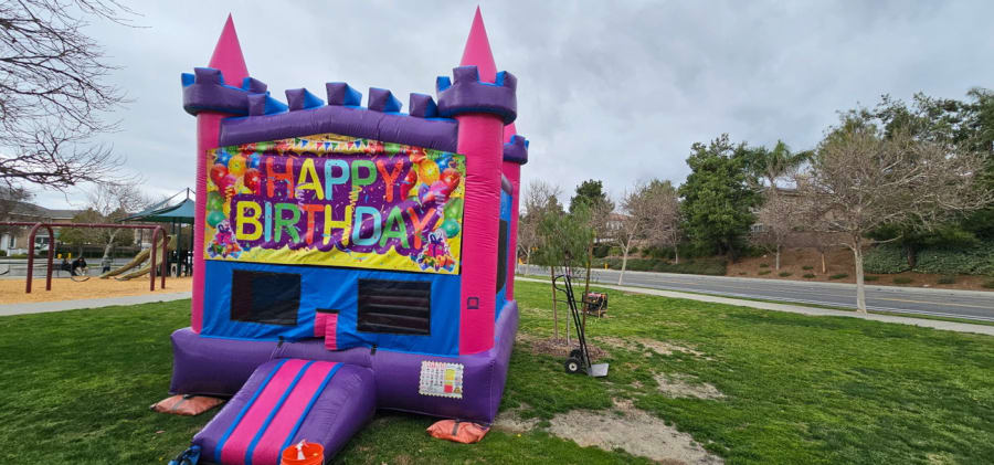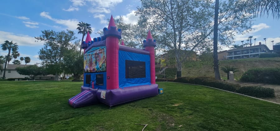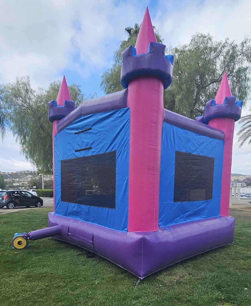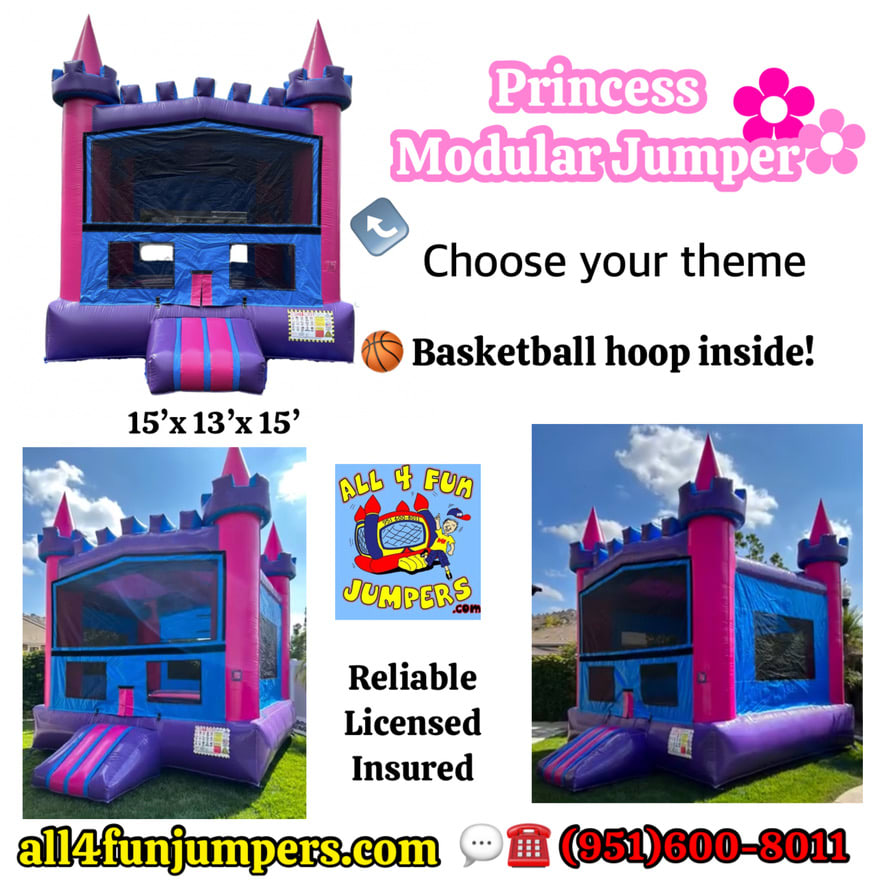 Booking is a breeze – reserve online, text, or call us at (951)600-8011. Proudly serving Temecula and neighboring cities, our Modular Jumpers offer various color options, including vibrant Standard Primary, engaging Castle with basketball hoop, charming Girl Modular, and Pink & Purple versions.Pink and Purple Castle Modular Jumper
