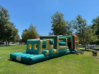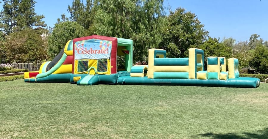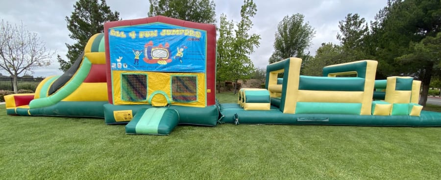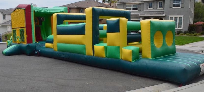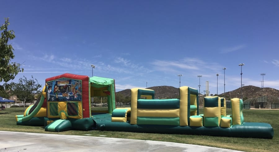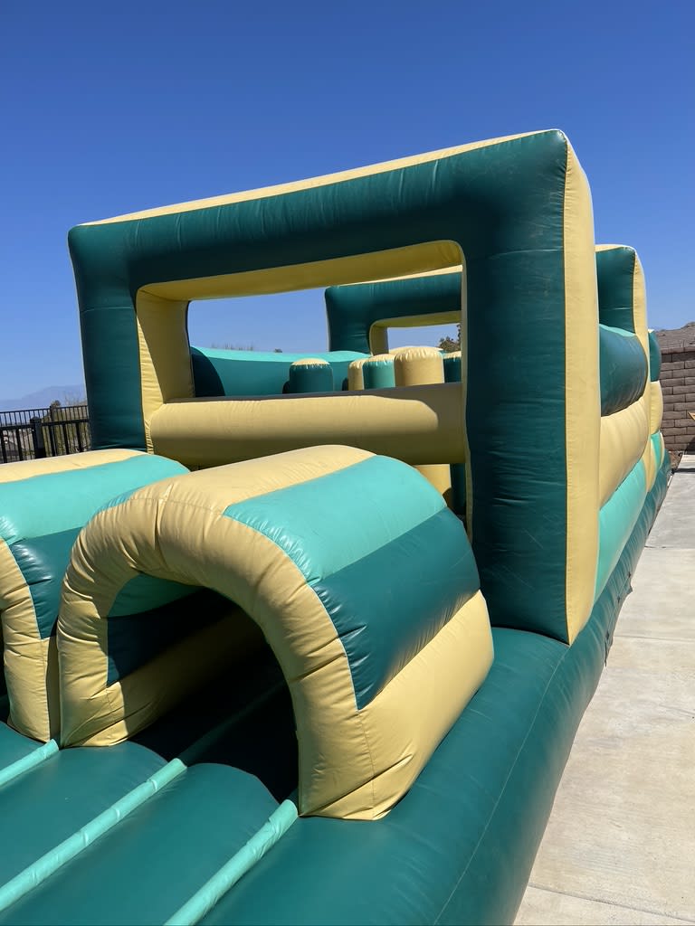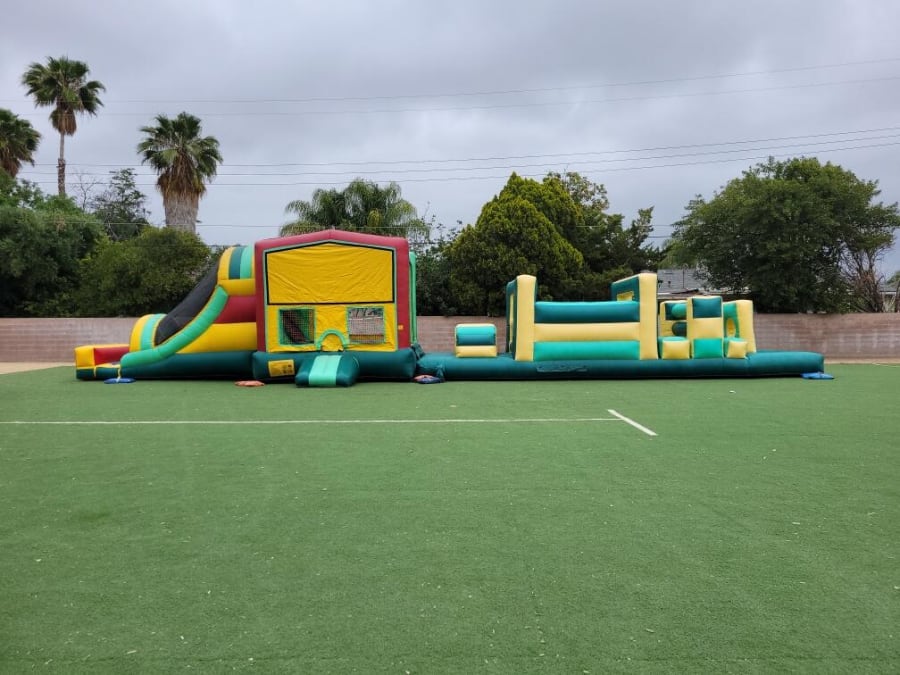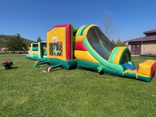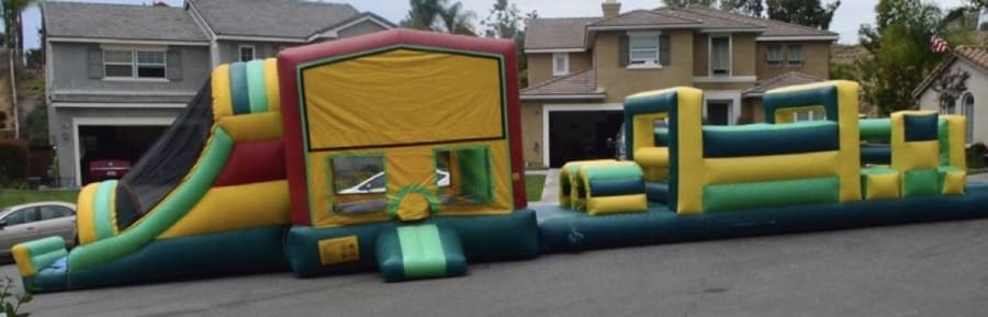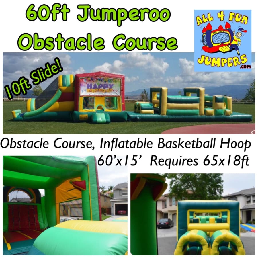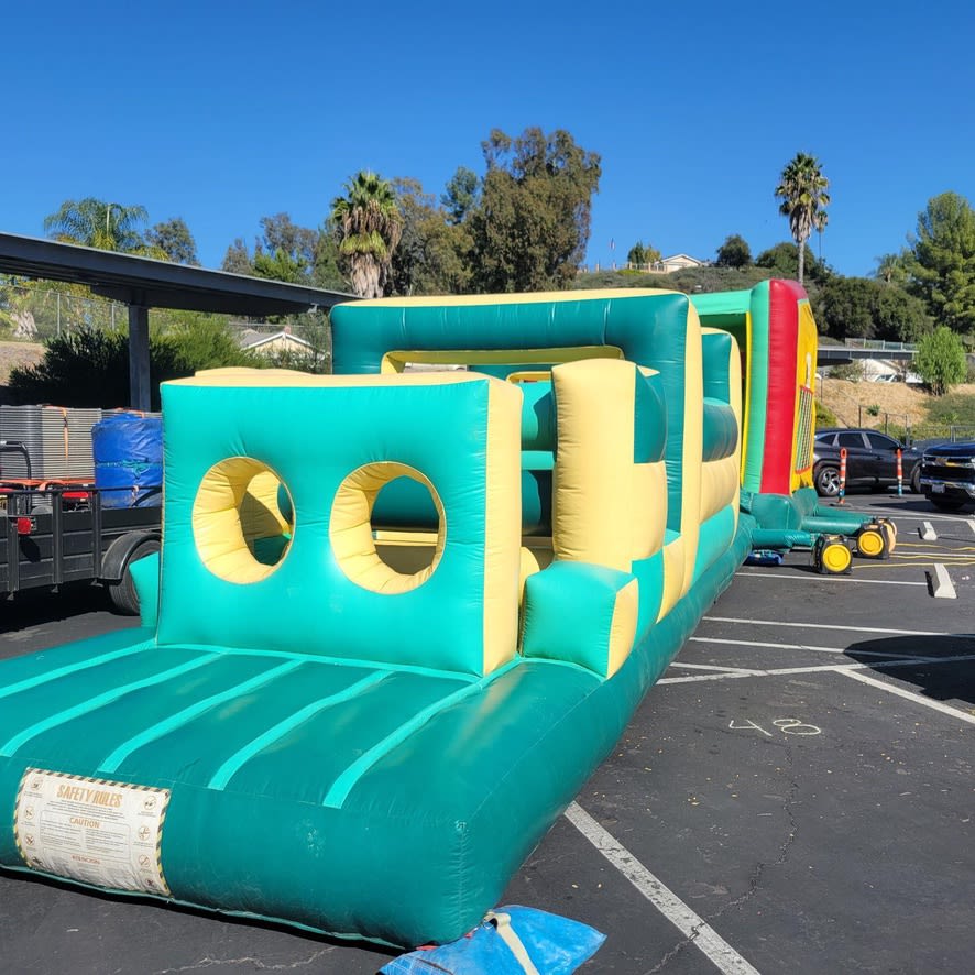 Explore the excitement of our 60 ft Jumperoo Obstacle Course, offering thrilling activities for all! Race through inflatable pillars, conquer obstacles, play with the inflatable basketball hoop inside, and end with a jumper and slide combo. Add a theme at the top from our selection of over 175 themes. If your theme isn't listed, contact us for a special order.