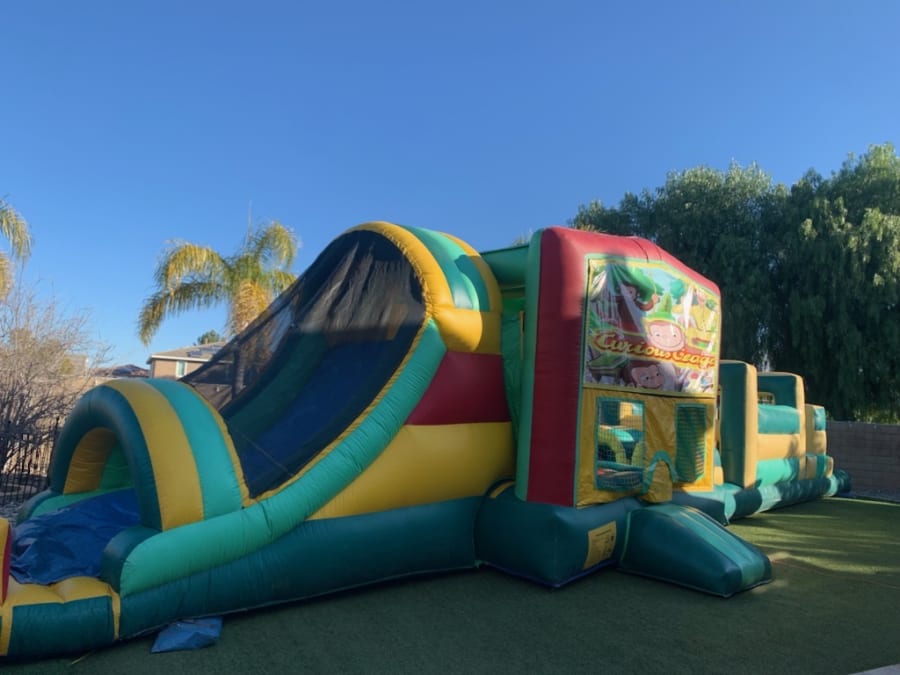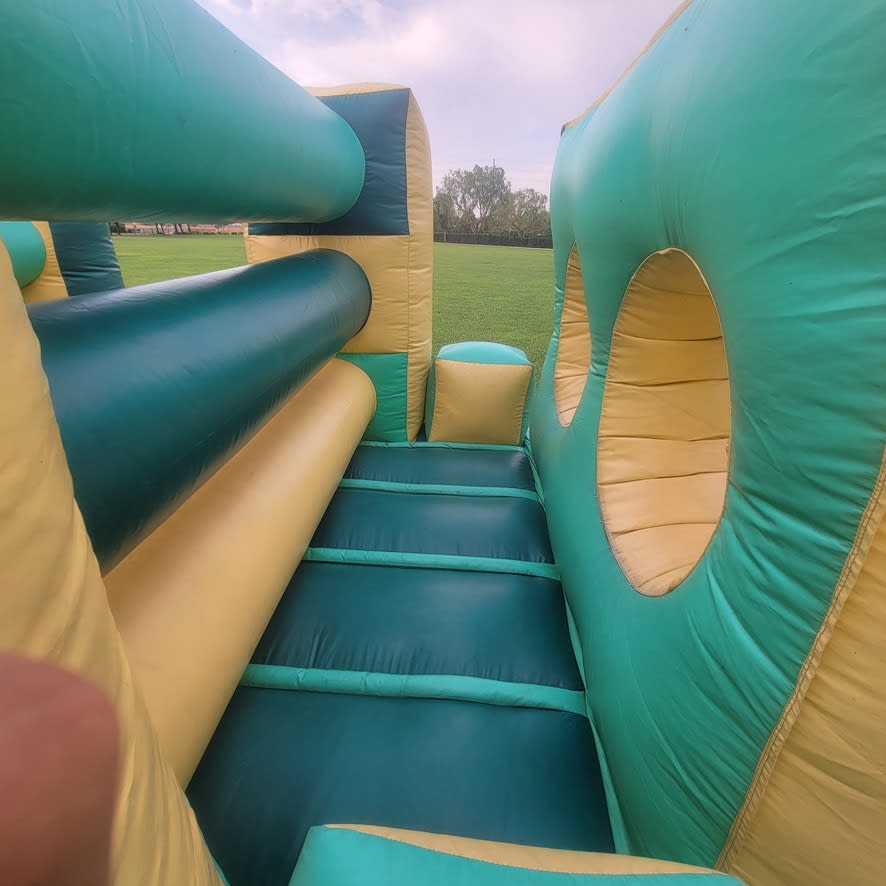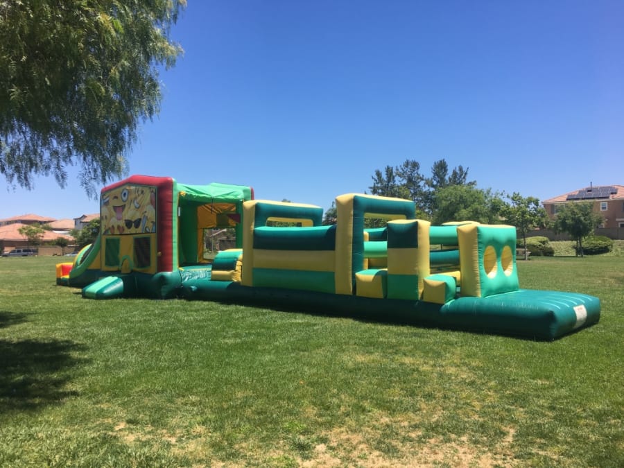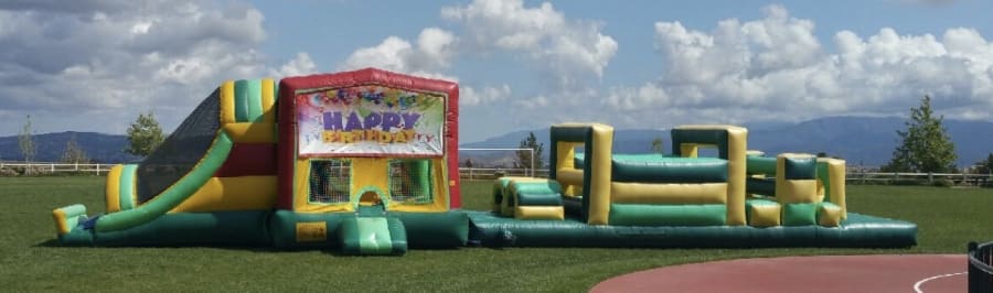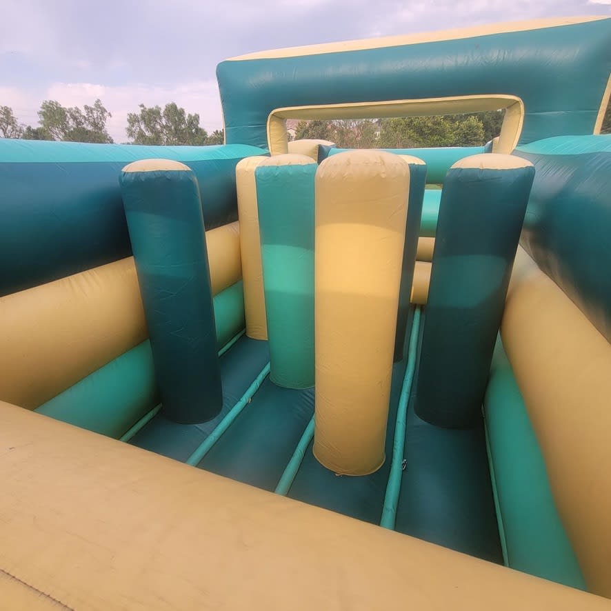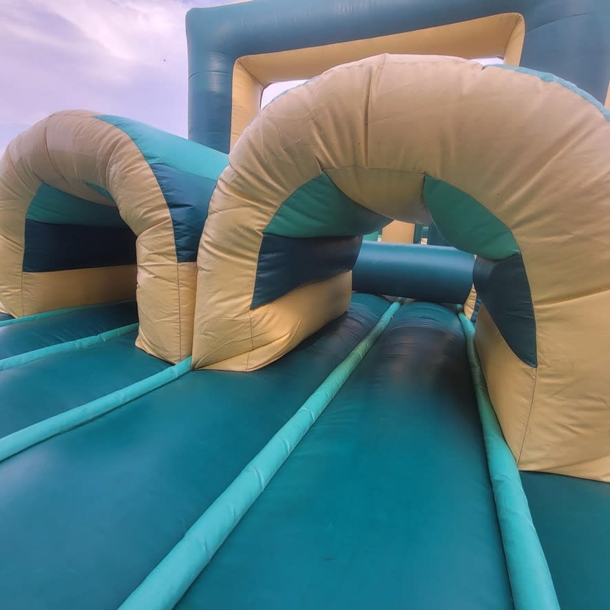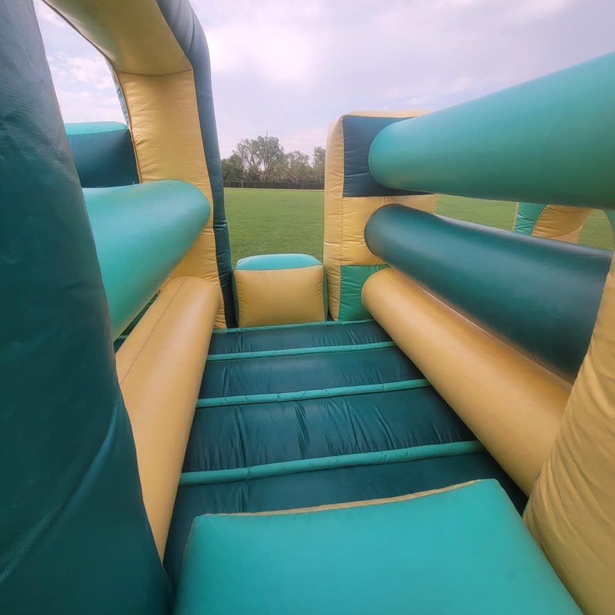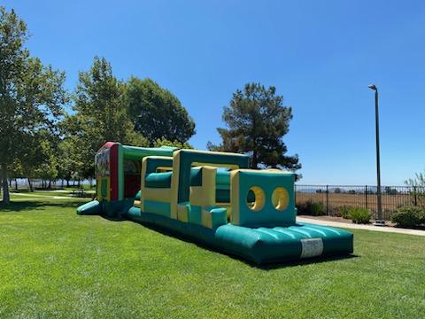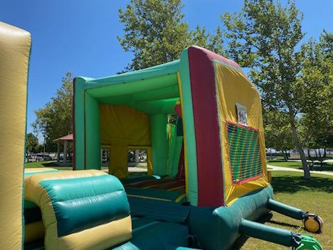 Explore the excitement of our 60 ft Jumperoo Obstacle Course, offering thrilling activities for all! Race through inflatable pillars, conquer obstacles, play with the inflatable basketball hoop inside, and end with a jumper and slide combo. Add a theme at the top from our selection of over 175 themes. If your theme isn't listed, contact us for a special order.