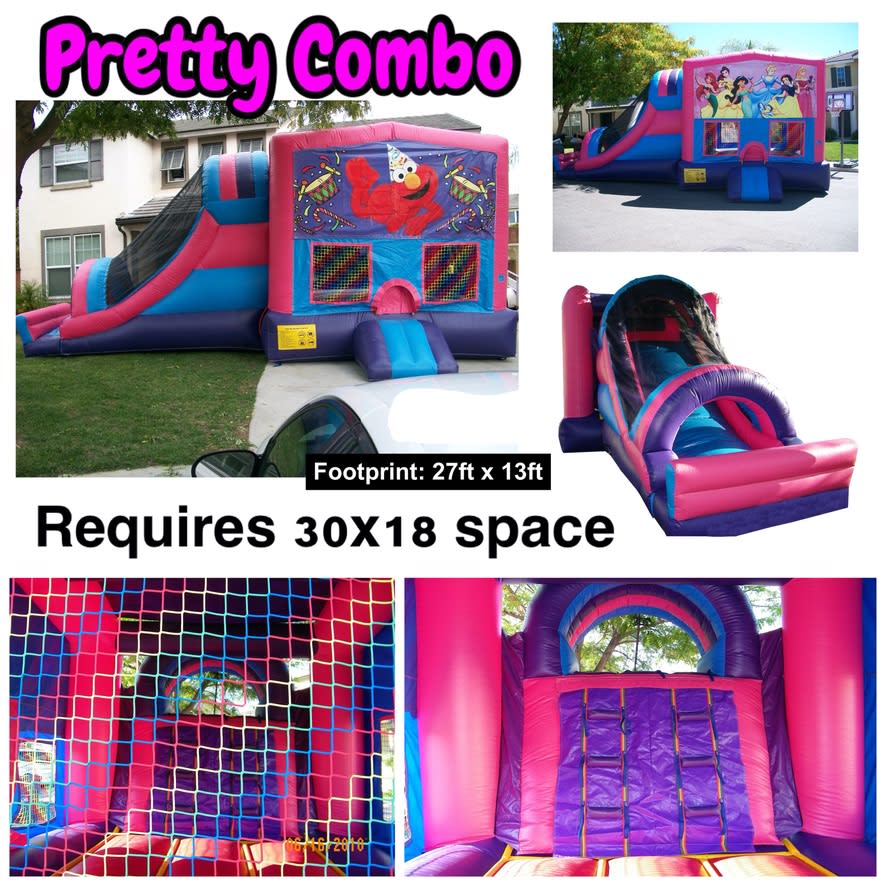 Introducing the Pretty Combo 3 in 1 Combo – a versatile choice with countless adorable princess-themed options. This modular combo offers jumping, climbing, and sliding activities, all customizable with a theme from over 175 choices. If your desired theme isn't listed, reach out – we might accommodate special orders for your event. Ideal for princess parties, tea events, spa parties, butterfly, flower, and girl power themes. Witness the delight in children's eyes as they encounter this surprise at the event – perfect for various functions and social gatherings entertaining both boys and girls.