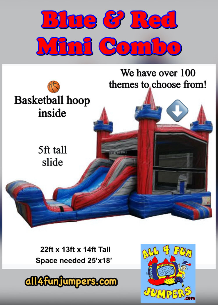 The Red and Blue Mini Combo is designed to fit seamlessly into any theme with over 175 customizable options. Whether you're planning an intimate backyard party or a large corporate gathering, this inflatable is sure to be a hit. Don't see the theme you're looking for? Text or call us (951)600-8011 or email us info@all4funjumpers.com to explore special order themes at a nominal cost, ensuring your event is truly one-of-a-kind.
